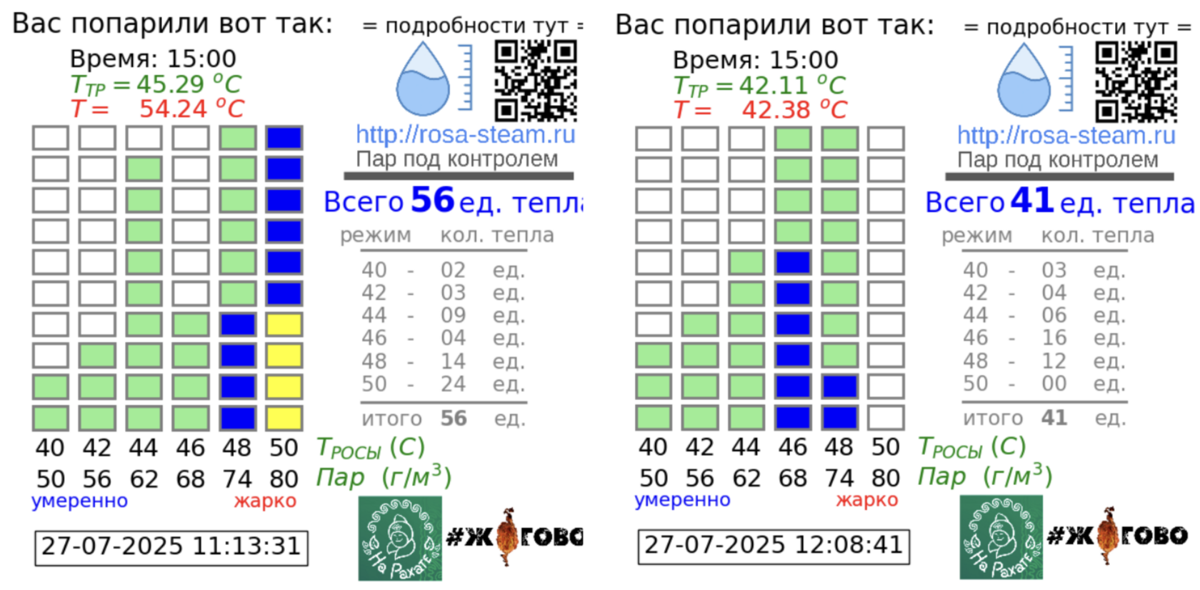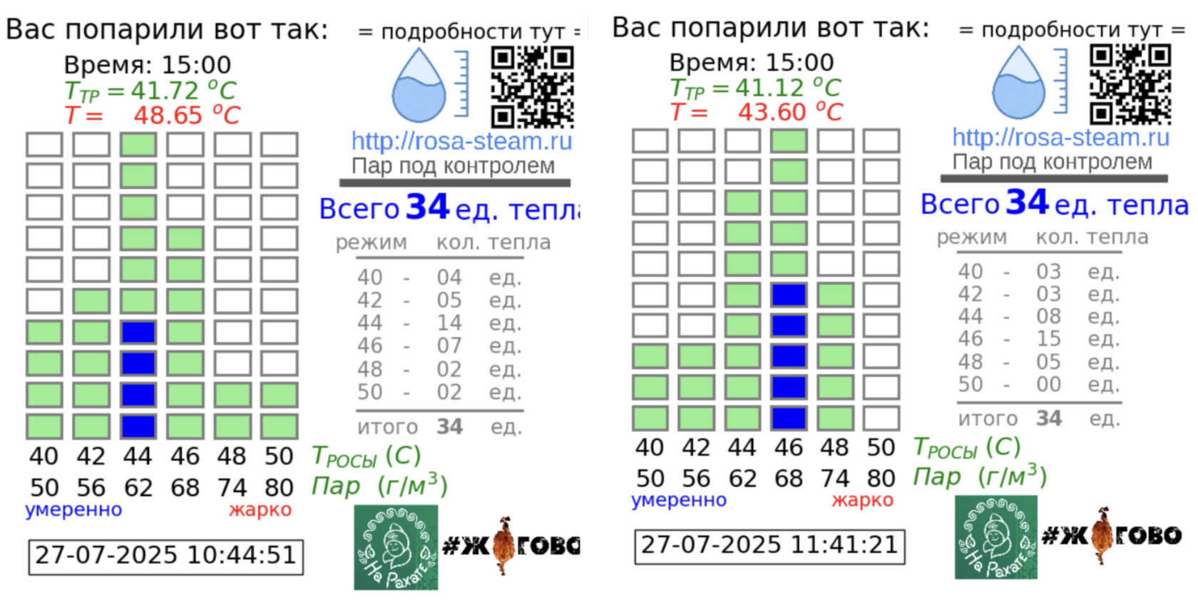 Самый показательный результат получился с первой моделью. В обоих парениях мастера передали одинаковое количество тепла — 34 единицы. Казалось бы, результат должен быть идентичным? Но нет!
