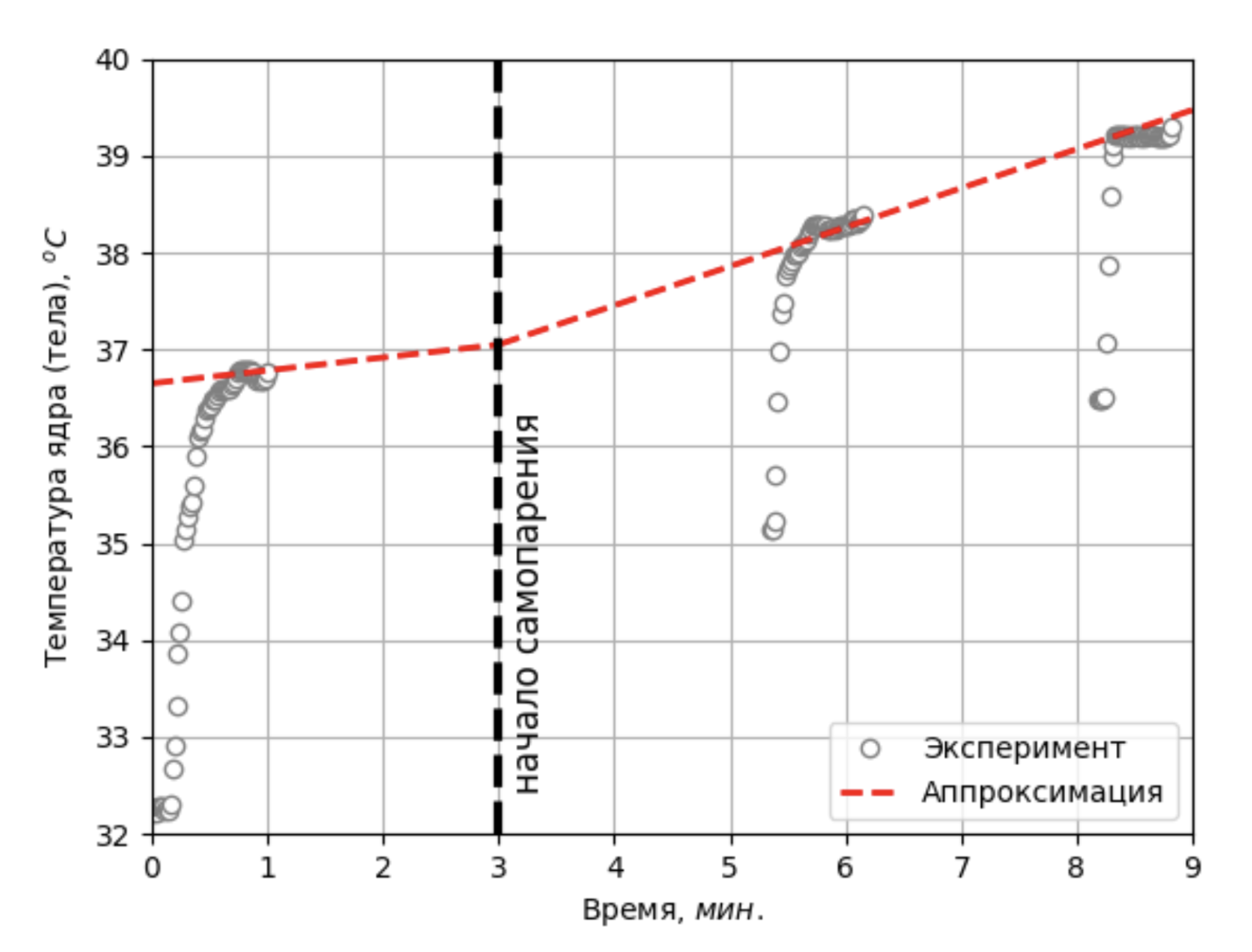 На графике показаны измерения температуры — точки, а также то, как она должна была меняться в соответствии с датчиками, регистрирующими тепловой поток (повезло, что они в тот момент стояли в парной). В соответствии с показаниями датчиков, скорость нагрева должна была увеличиться примерно в 3 раза (в 2.96, если быть точным). Тогда температура тела должна была меняться так, как идёт красная пунктирная линия.
